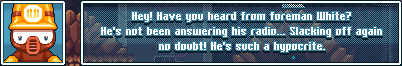 Foreman White is the overseer of a cleanup mission on Asteroid 512 in the Seroza system, Canary Mining Colony CM08, in the game Canary. His attitude is bossy, and according to Canary (Orange), he is a hypocritical slacker, telling others to wok harder when he himself is doing very little.