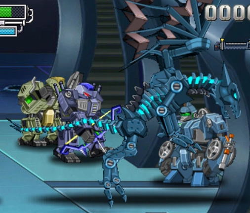 A demon/knight-like robot, it attacks by spinning its wings or by shooting bombs. Its second form resembles a lightning-breathing dragon.